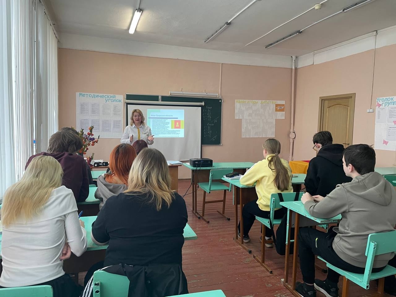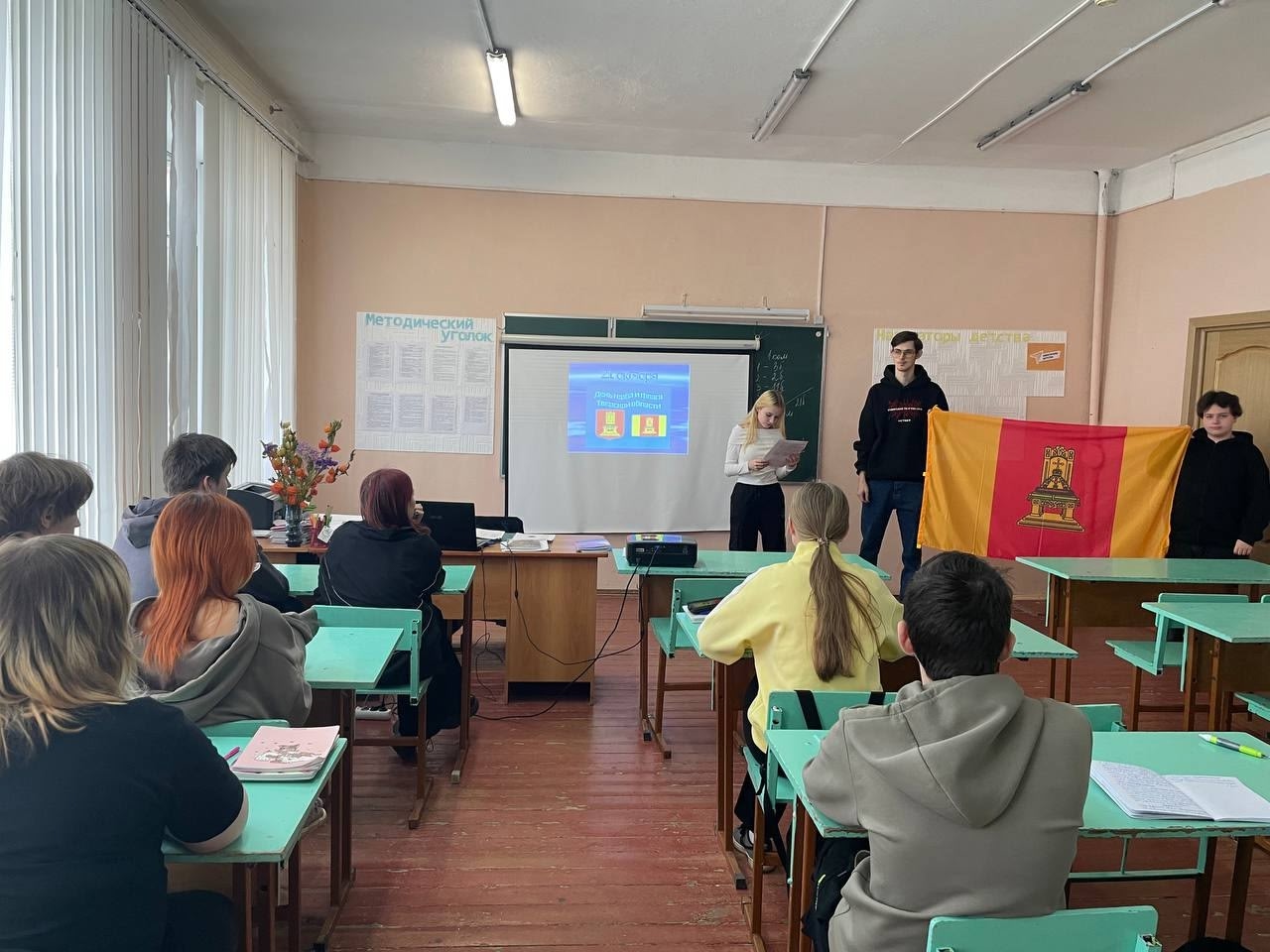 Флаг Тверской области состоит из двух четвертей желтого цвета и двух четвертей красного цвета, что символизирует тот факт, что территория Тверской области состоит из тверских, новгородских, псковских и смоленских земель. Цвета полос флага имеют свое значение. Красный цвет символизирует храбрость, отвагу и готовность к защите своей родной земли. Желтый цвет олицетворяет мудрость, богатство земли и достаток края. Герб Тверской области включает три элемента, каждый из которых имеет важное и самостоятельное значение: золотой (желтый) стол (трон) тверского герба; корона (шапка Мономаха) тверского герба и червленый (красный) цвет поля геральдического шита. Для обучающихся, советником директора по воспитанию Хатаженковой Ю.В., была проведена беседа по истории и символике флага и герба Тверской области, а затем проведена квест- игра "Герб и флаг Тверской области"