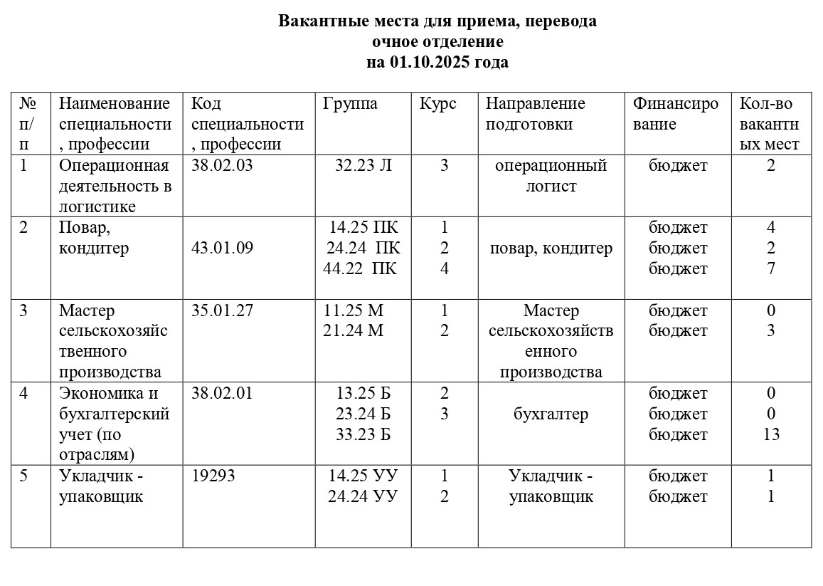 Вакантные места на 01.10.2025 года